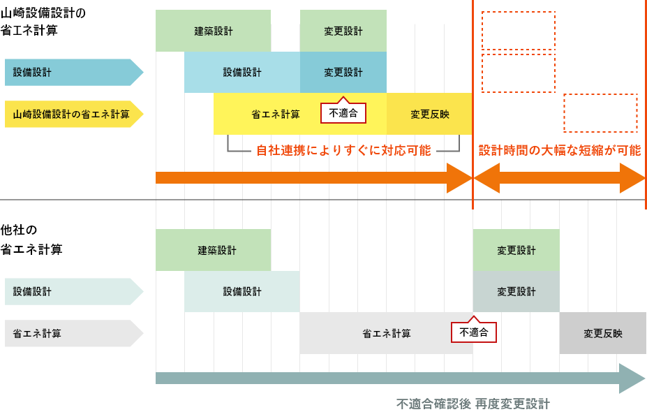 弊社では設備設計と省エネ計算を社内で連携できますので、